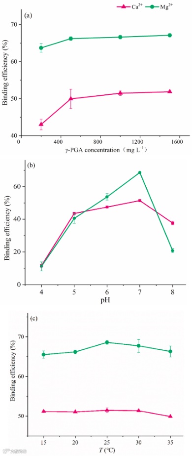 图1 γ-PGA浓度(a)、pH (b)和温度(c)对盐渍土壤中Ca2+和Mg2+结合的影响
