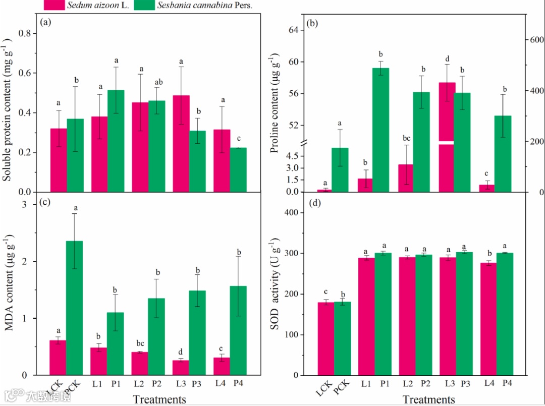 使用景天三七和田菁幼苗进行盆栽实验,100 mL不同浓度的γ-PGA 溶液加入1.5kg的供试土中并充分混合,然后分别填充在塑料盆中。在对照处理中,使用100 mL去离子水代替γ-PGA溶液。将生长相似的盐生幼苗移植到花盆中进行栽培。研究期间没有施用肥料。自然采光下相对湿度为62%–68%,温室温度为25±3°C。56天采集植物样品,立即测量鲜重和株高。人工分离植物叶片,在冰浴中完全匀浆,测定脯氨酸、可溶性蛋白、丙二醛和超氧化物歧化酶等生理参数。