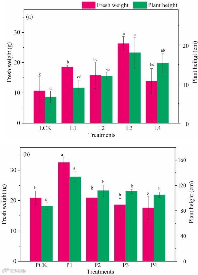 图 5 γ-PGA对景天三七(a)和田菁生长的影响(b)(不同字母表示在5%置信水平下,处理之间存在显著差异)