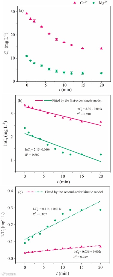 图 2 添加γ-PGA(a).后土壤中水溶性Ca2+和Mg2+的浓度变化拟一阶动力学模型(b)和二阶动力学模型(c)(γ-PGA浓度:1000mgL−1,pH:7,T:25◦C)的拟合曲线。