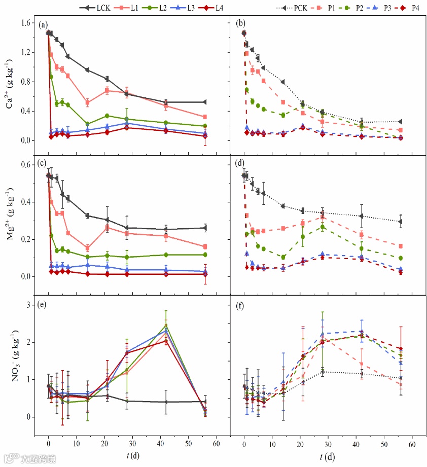 根据Ca2+和Mg2+与γ-PGA的结合能力,研究盐生植物对γ-PGA对盐土的修复性能,结果如图4所示。对于对照处理土壤中Ca2+和Mg2+的含量随着培养时间的增加而降低。培养56天后,景天三七对Ca2+和Mg2+的去除效率分别为64.10%和51.90%(图4a和c),施用γ-PGA后,土壤中NO3-含量呈先略有下降,然后迅速上升,最后迅速下降的变化趋势(图4e和f)。NO3-在L1、L2、L3和L4中56天的去除效率分别为82.09%、88.46%、84.26%和77.13%。与LCK相比,γ-PGA的应用可以有效地去除土壤中的NO3-。