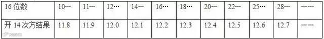 要理解这道题,先要从一则寓言故事说起:阿基米德下棋赢了国王,向国王索要的奖赏是“在棋盘上第一格放一粒米,第二格放二粒,第三格放四粒……”。国王以为这很简单,却没想到动用全国的粮食都远远满足不了。这则寓言表现的是“几何级增长”的威力,即可以使一个小数字通过“N次方”迅速扩散变大。而“开N次方”却是反其道而行之,可以使一个大数字迅速收缩变小。了解了这个原理,就知道“16位数字开14次方”会收缩到一个小范围,实际上任意16位数字开14次方,其结果的整数位只有11、12、13三种情况,即便其结果如现场表演中那样精确到第一个小数位,也只有22种情况。所以如下图所示,记下这22种情况以及其对应的16位数字头两位所在区间,就可轻易作答。