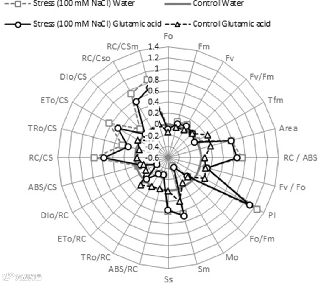 此外,PSII活性反应中心的密度在t0(RC/CSo) 和tmax(RC/CSm)在胁迫植物中显着增加+68.0%和+75.7%。同样,与对照组相比,应激样品的每截面电子传输通量和关闭所有反应中心所需的能量更高。压力和治疗之间的显著相互作用在Sm值中显示。同时,盐暴露导致每个反应中心作为热量的能量耗散、每个反应中心的吸收能量通量、每个反应中心的捕获能量通量和中心关闭的净速率显着下降。相反,盐胁迫和谷氨酸处理对PSII的最小荧光(Fo)、最大荧光(Fm)、可变荧光(Fv)和最大量子效率(Fv/Fm)没有显著影响。两种生长条件下的Fv/Fm值均约为0.86。
