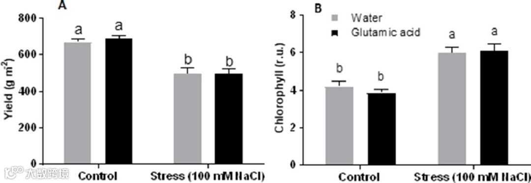 图 1.在非胁迫和盐胁迫条件下生长并用水或谷氨酸溶液处理的生菜植株的产量