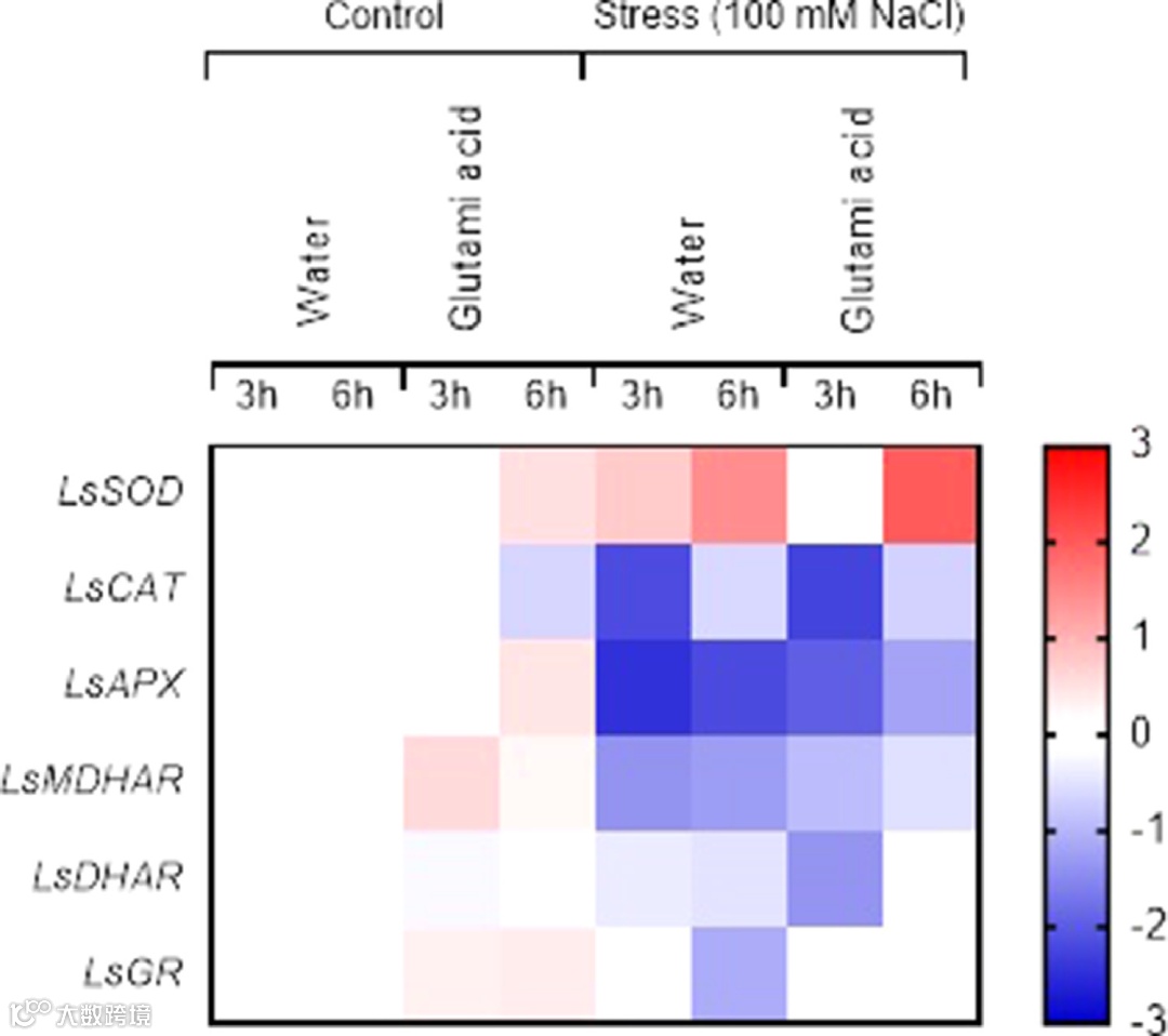 参与抗氧化防御系统的基因表达变化已聚类到热图中(图5)。从图中可以看出,LsCAT、LsAPX、LsMDHAR和LsDHAR的表达水平在盐胁迫下具有强烈的下调性,尤其是3h后。不同的趋势导致了对盐胁迫、治疗和期间的反应。在对照条件下,3小时和6小时后,用水处理的植物和用谷氨酸溶液处理的植物之间的基因表达水平相似。