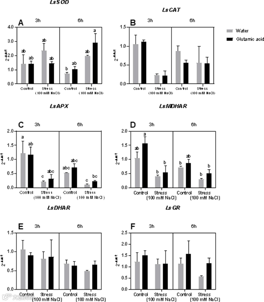 图 6.在非胁迫和盐胁迫条件下生长并用水或谷氨酸溶液处理的生菜叶中LsSOD(A),LsCAT(B),LsAPX(C),LsMDHAR(D),LsDHAR (E),LsGR(F)的表达水平