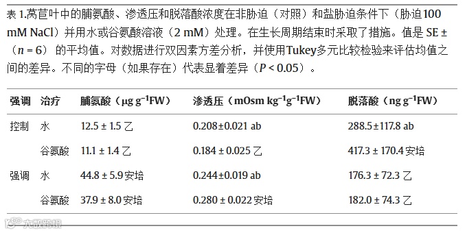 测量脯氨酸水平,以评估其在定义莴苣对 NaCl 的耐受性方面的潜在作用,并结合谷氨酸处理。在没有盐的情况下,无论处理方式如何,莴苣植株的叶子中都含有相同量的脯氨酸(表1)。盐胁迫显著影响莴苣叶片中脯氨酸和渗透压的水平(表1)。特别是,脯氨酸的平均值为11.8μgg−1在非应激条件下生长的植物中,约63.9μgg−1在受压植物中。在用水处理的对照植物和胁迫植物之间观察到显着差异。然而,高变异性不允许在应激样品中看到谷氨酸处理的任何显着效果。