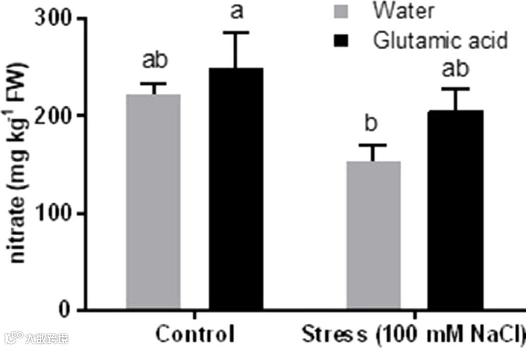 图 3.在非胁迫和盐胁迫条件下并用水或谷氨酸溶液处理的生菜叶中测量的硝酸盐含量