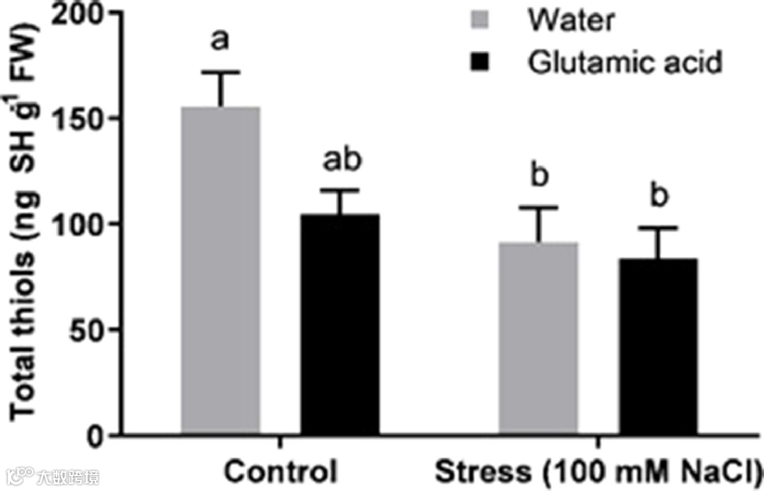 图 4.在非胁迫和盐胁迫条件下生长并用水或谷氨酸溶液处理的生菜叶中的总硫醇浓度