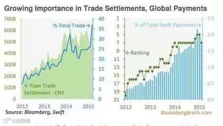 受中国经济趋冷的影响,一些经济学家表示他们不排除北京政府可能会再次强迫人民币贬值以改善出口贸易。以下的图表将帮助大家看到人民币在全球交易中的地位正逐步上升。