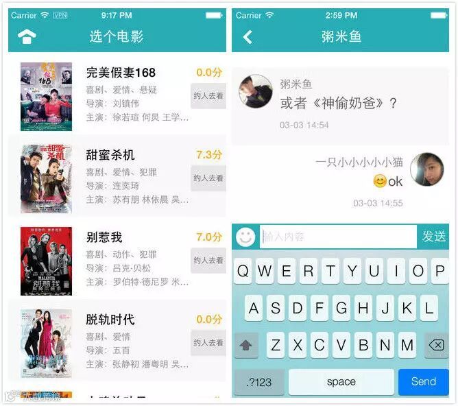 类似于 facebook 上的暗恋应用 Crush Notifier 和交友应用 Bang with friends。通过微博导入好友,让用户设置自己能接受的时间和地点范围,然后一屏一屏的出现好友的头像,觉得愿意一起看电影的就打钩。然后系统根据时间、地点、意愿都匹配上的双方,出现在一个列表里面,可以即时聊天沟通,进一步确定具体时间地点、生成一个看电影约会列表,问题解决。