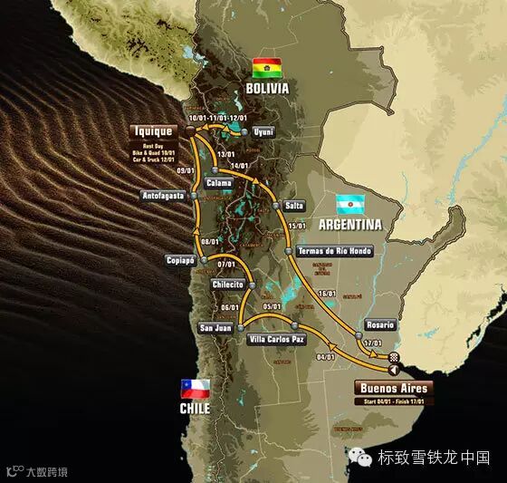 从达喀尔拉力赛的标志上就能看出比赛的艰难程度,画面中的人物像一位层层包裹着头巾,在沙漠中穿行的旅人。而沙漠地带风沙凛冽、变化莫测,在这里若要展开一场赛车间的角逐其难度可想而知。在比赛中,除了沙漠外,车手们还要渡过大海,穿越草原与热带雨林,赛程中的艰难是常人无法想象的,但是这阻止不了一群对赛车痴迷,无畏极限挑战的勇者。