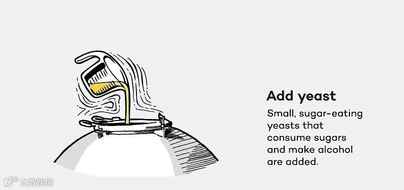 Small, sugar-eating yeasts that consume sugars and make alcohol are added.