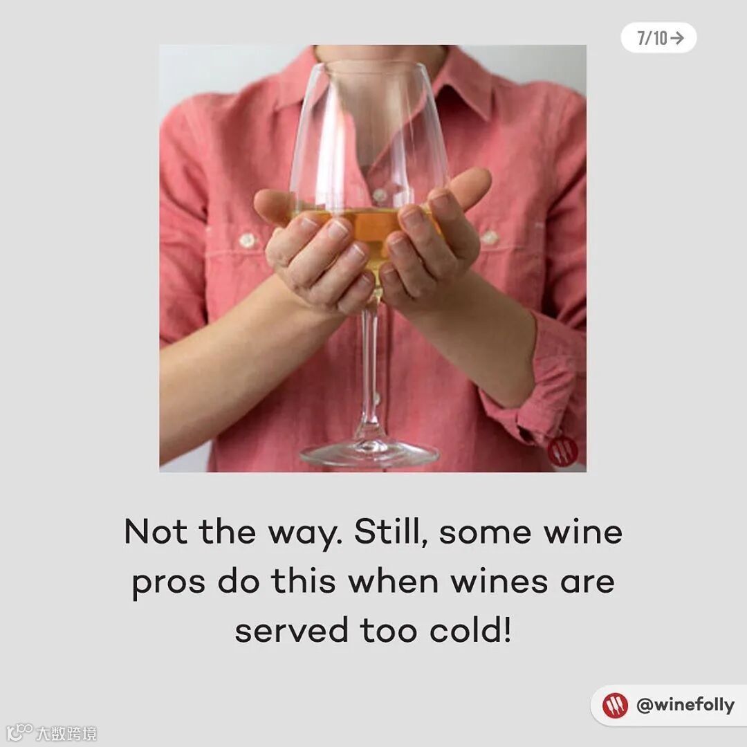 Not the way. Still, some wine pros do this when wines are served too cold! 这样也不正确。不过,一些葡萄酒专业人士会在酒感觉温度较低,不太适合最佳饮用时,也会这样做!