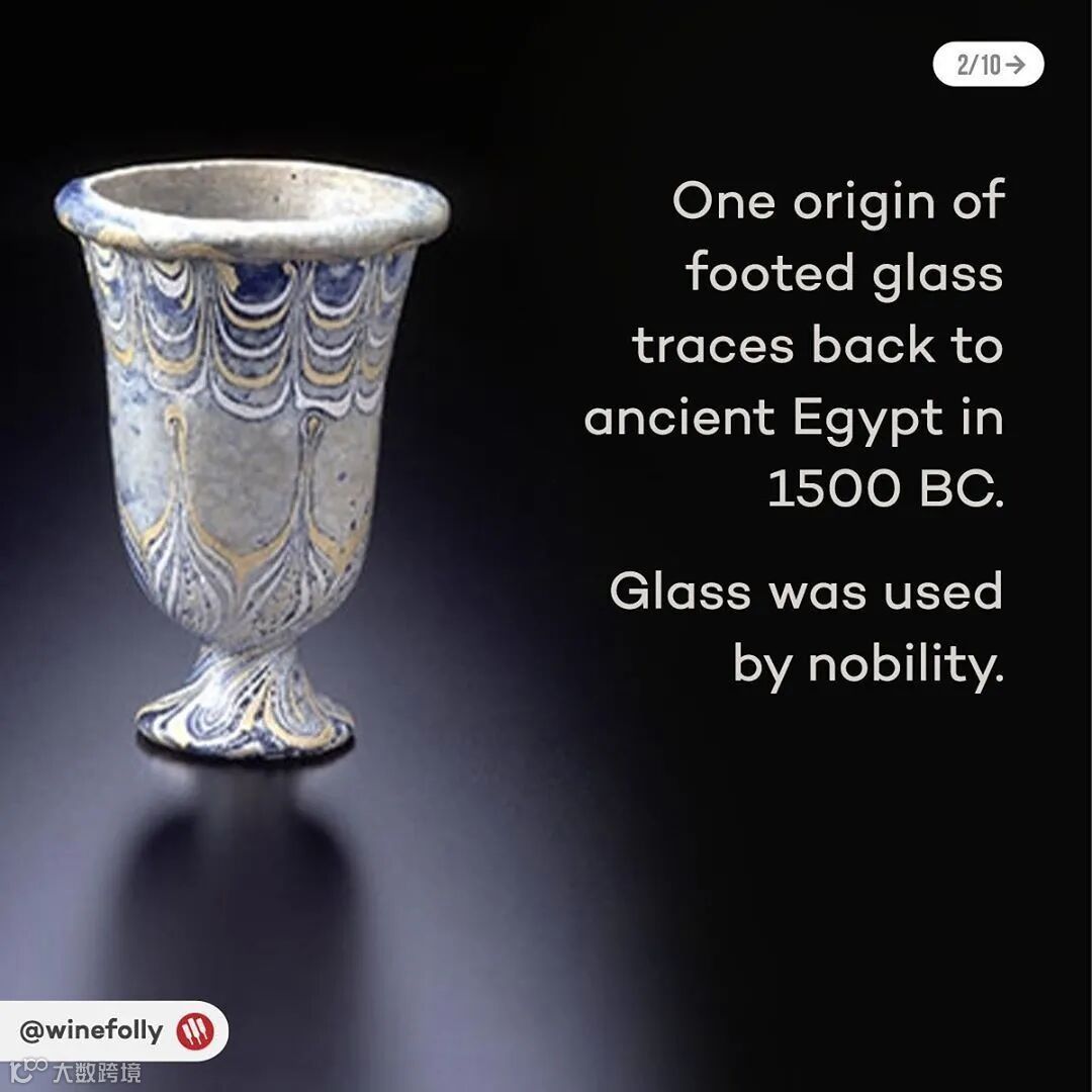 One origin of footed glass traces back to ancient Egypt in 1500BC. Glass was used by nobility. 有脚玻璃杯的起源可以追溯到公元前1500年的古埃及,那玻璃制品是贵族们的专享。