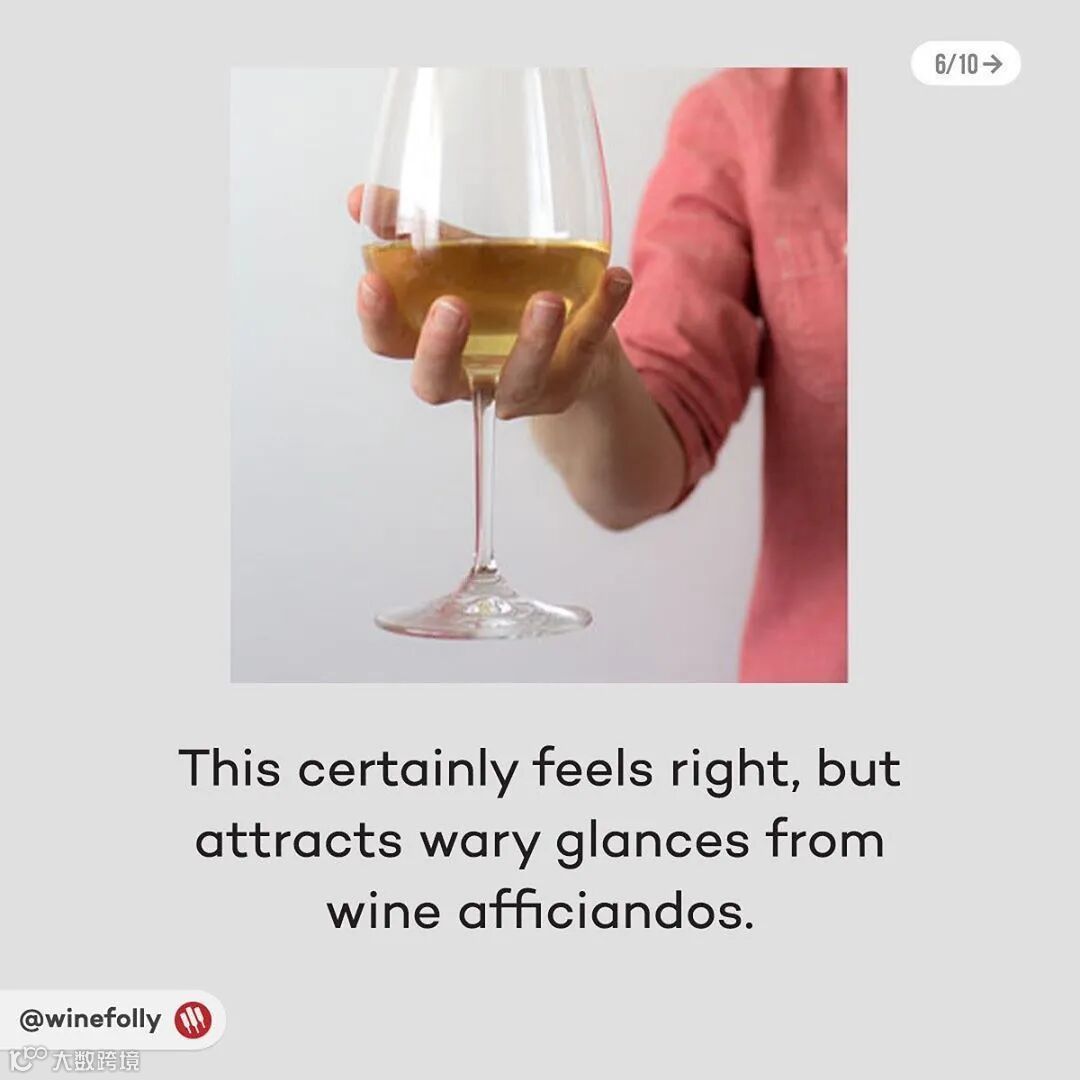 This certainly feels right, but attracts wary glances from wine athiciandos. 这样端着,感觉当然不错哈,但也会遭遇葡萄酒行家们警惕的目光。