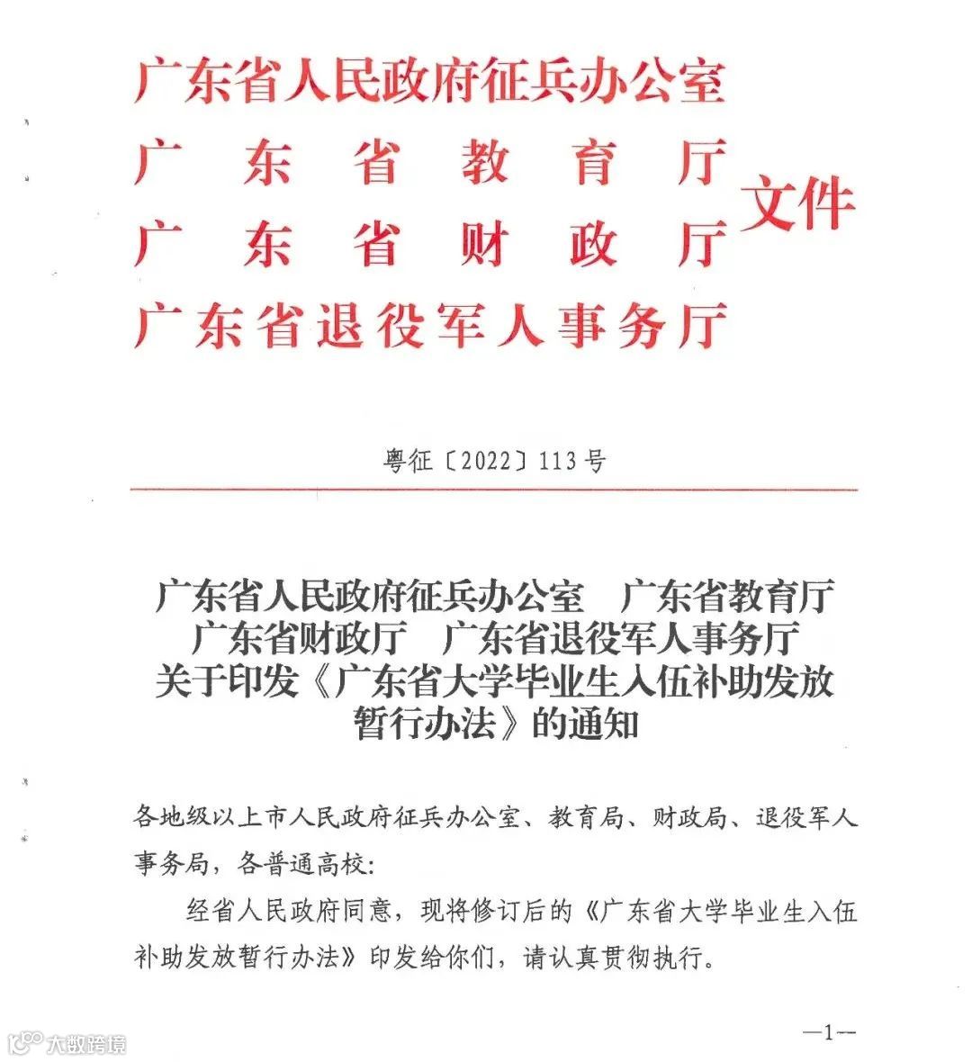近日,广东省人民政府征兵办公室、广东省教育厅、广东省财政厅、广东省退役军人事务厅联合下发了《广东省大学毕业生入伍补助发放暂行办法》的通知。