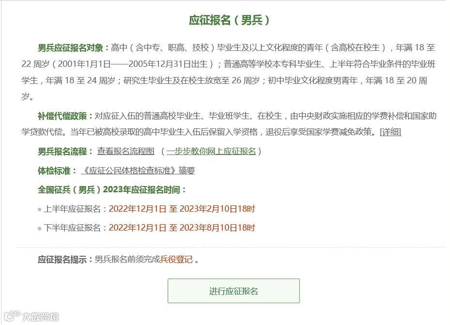点击“应征报名(男兵)”后,出现的页面会告知报名时间以及参军政策说明,建议大家认真阅读后,随后点击“进行应征报名”。
