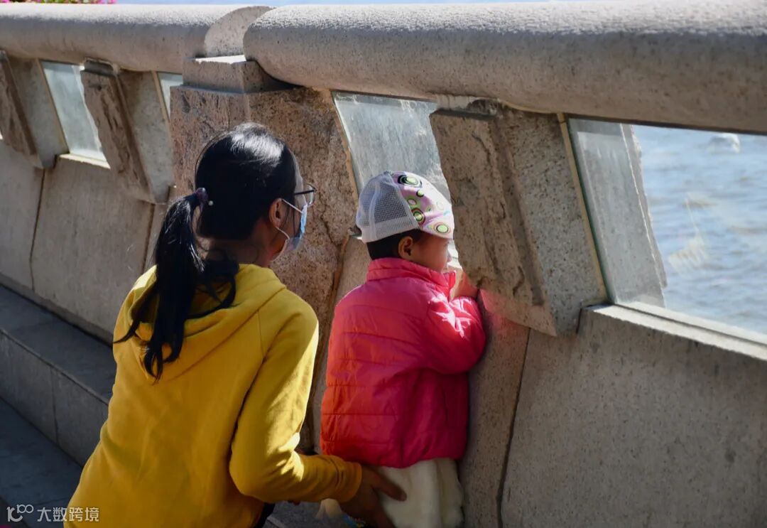 在沿江中路,一位妈妈带着孩子,观看珠江上的白鹭。