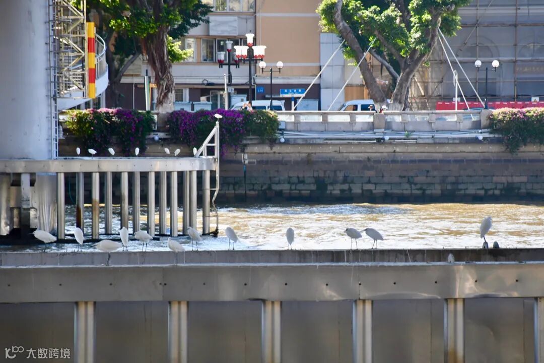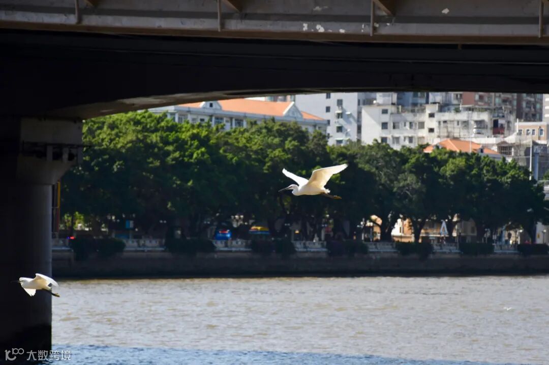 在滨江西路解放桥底,三四十只白鹭栖息在桥墩下,或盈盈而立,或扑着洁白的翅膀,一有船只经过,成群白鹭就会飞上天盘旋鸣叫。随着珠江退潮,不远处一盏红色灯塔下的礁石浮出水面,几只白鹭展开翅膀,轻踏水面,用细长的喙啄食小鱼小虾,整个过程像极了一场“水上芭蕾”。