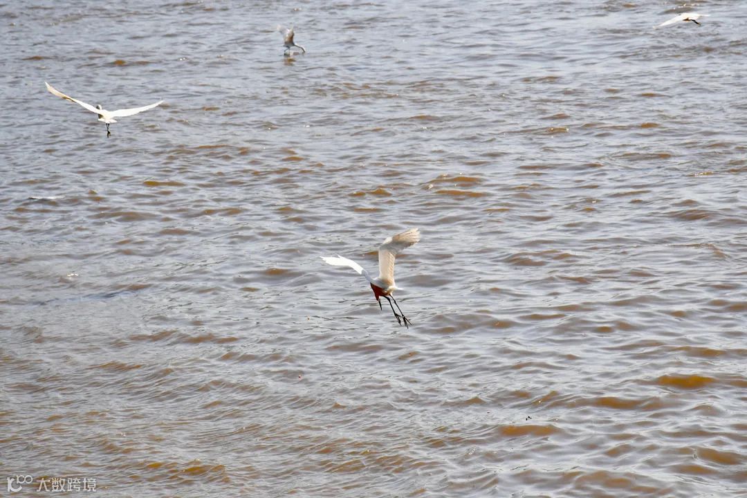 滨江西路红色灯塔附近,几只白鹭展开翅膀,轻踏水面。