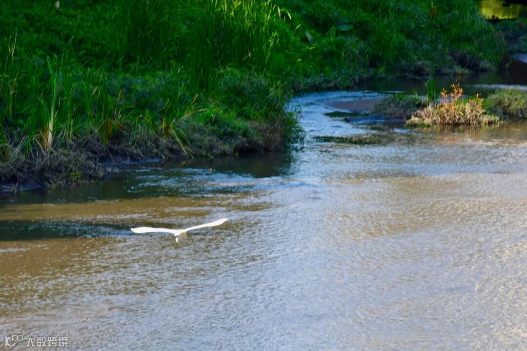 猎德涌上,一只白鹭在水面上轻盈翩飞。