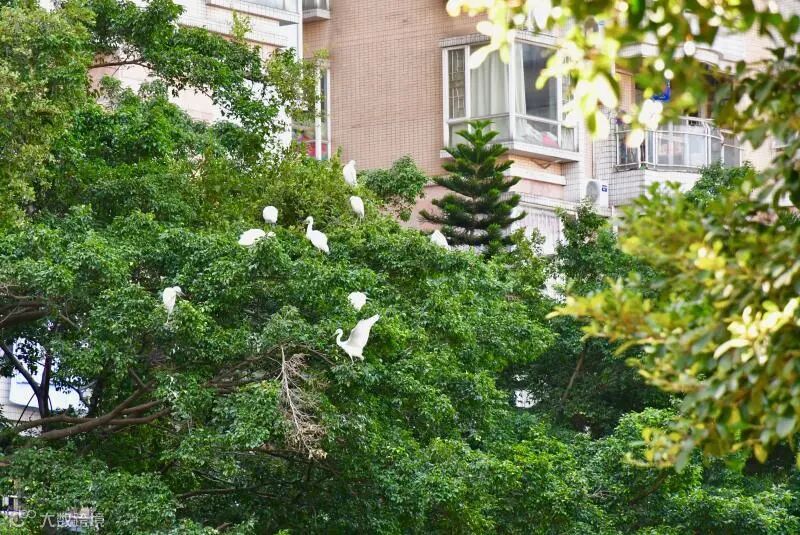 海珠区雅墩街海珠涌段,在涌边不经意间就见到一抹靓丽白影。在雅墩街关帝庙旁,几十只白鹭正安静地栖息在树丛中。