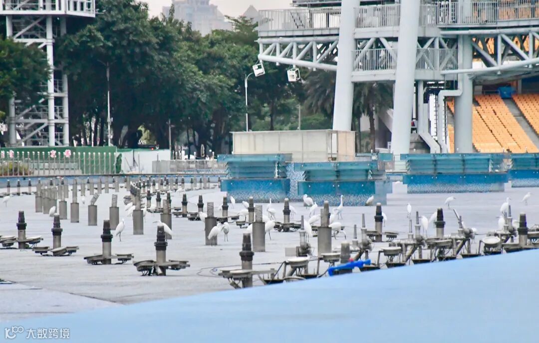 海心沙亚运公园的喷泉广场上,成群白鹭来回踱步。