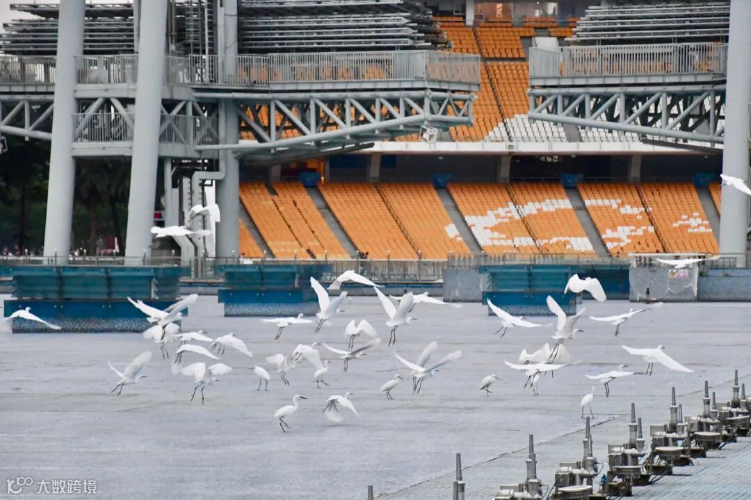 海心沙亚运公园的喷泉广场,成群白鹭起飞。