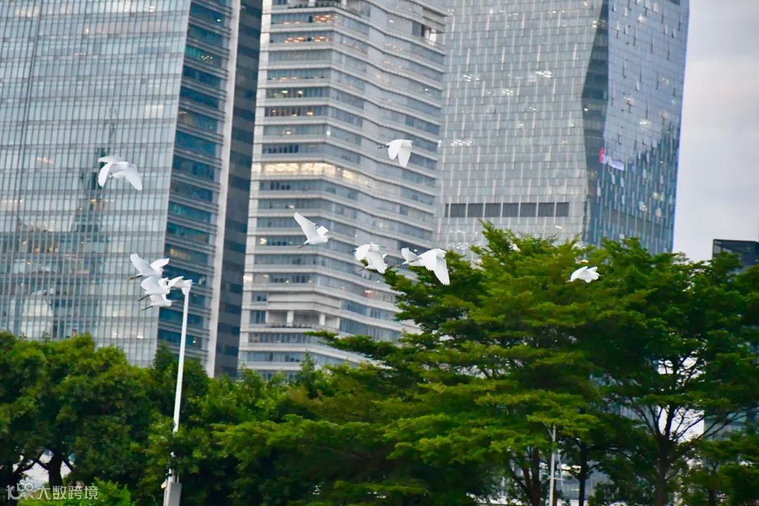位于海心沙亚运公园的喷泉广场,大群的白鹭在广场上舒展着羽毛,来回踱步,惬意自然。太阳逐渐落山,成群的白鹭起飞,伴着暮色,以珠江新城CBD为背景,飞向了海心沙岛东面的树林,为城市增添了不少灵动与野趣。