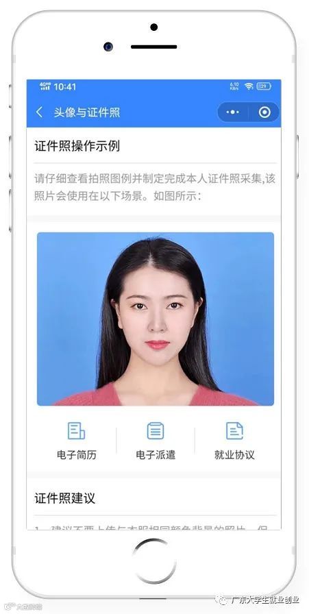 生成后的证件照可适用于简历、派遣、三方协议等系统中的多个服务场景(证件照经过公安部后台校验,符合国家证件照规格,同学萌就不用再跑照相馆了。)