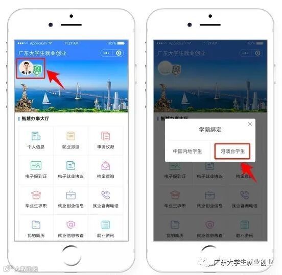 进入“广东大学生就业创业”小程序,在首页左上角找到“用户登录”,点击后出现两个弹窗“中国内地学生”“港澳台学生”,选择 “港澳台学生”。
