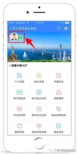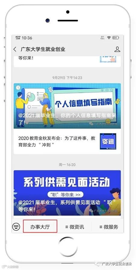 搜索“广东大学生就业创业”微信公众号,关注公众号并点击进入菜单栏“办事大厅”。