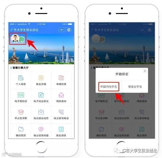 进入“广东大学生就业创业”小程序,在首页左上角找到“用户登录”,点击后出现一个弹窗,出现两个选项:“中国内地学生”“港澳台学生”,选择 “中国内地学生”选项。