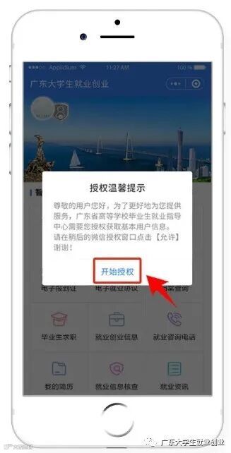 进入小程序首页自动显示授权温馨提示,点击“开始授权”弹出小程序授权窗口。