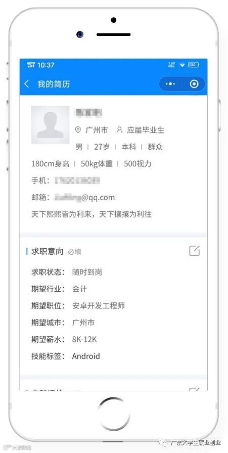 来到“广东大学生就业创业”小程序,点击“毕业生求职”或“我的简历”模块,已经绑定过学籍的同学即可完善简历并投递。