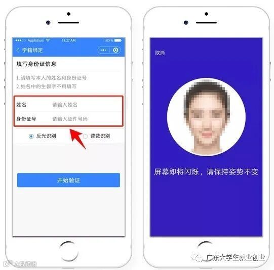 进入“学籍绑定”页面,点击”开始验证”,并完成人脸识别身份认证。
