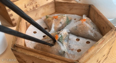 晶莹透明,红红绿绿的粿馅分明可见,十分惹人喜爱。