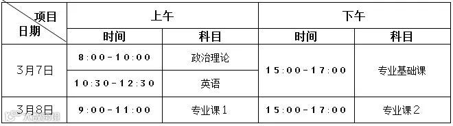 普通高校本科插班生除英语以外的专业招生考试科目为五门,其中省统一考试三门,高校自主考试两门专业课。本科插班生招生考试时间为2020年3月7日(星期六)至8日(星期日)两天,具体安排见下表: