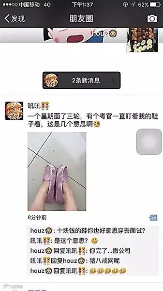 “吼吼”是重庆大学大四学生,她说:“有个考官一直盯着我的鞋子看,这是什么意思啊?”该网友还拍了一张自己穿鞋的照片,传到了网上。朋友调侃她说:“十块钱的鞋你也好意思穿去面试?”