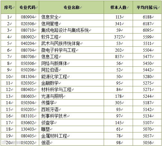 从国家设置的标准专业(统计样本在50人及50人以上)看,平均月薪最高的是信息安全,为6188元;其次是信用管理,为6187元;第三是集成电路设计与集成系统,为6095元。