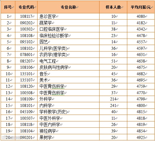 本科毕业生专业平均月薪最低20位