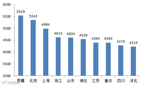 在广东省外地区中,平均月薪最高的是西藏自治区,为5529元,其次是北京市,为5343元,第三是上海市,为4984元。