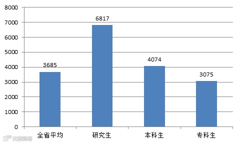 2017年毕业生初次就业的平均月薪(本报告的薪酬均指毕业生初次就业(不含升学、出国出境)时的月薪,月薪大于1000且小于50,000元才纳入统计样本。各院校获取毕业生薪酬数据信息主要来源于毕业生的三方就业协议书、劳动合同和就业调查)为3685元,其中毕业研究生的平均月薪为6817元,本科毕业生的平均月薪为4074元,专科毕业生的平均月薪为3075元。