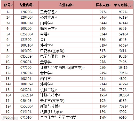 在就业人数最多的前20个专业中,月薪最高的是计算机科学与技术(理学类),为10412元,其次是计算机技术,为10206元;最低的是外科学,为4799元,其次是内科学,为4800元。就业人数较多的专业中,比全省研究生平均薪酬高的还有工商管理(9727元)、电子与通信工程(9302元)、金融学(7496元)、会计学(7052元)等等;而公共管理(6218元)、临床医学(6391元)、金融(5916元)等等专业则低于研究生平均水平。