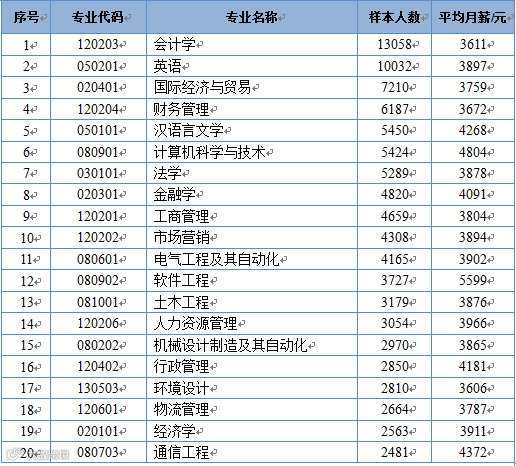 在就业人数最多的前20个专业中,月薪最高的是软件工程,为5599元,其次是计算机科学与技术,为4804元;最低的是环境设计,为3606元,其次是会计学,为3611元。就业人数较多的专业中,比全省本科生平均薪酬(4074元)高的还有汉语言文学(4268元)、金融学(4091元)等专业;而会计学(3611元)、英语(3897元)、国际经济与贸易(3759元)等专业则低于本科生平均水平。