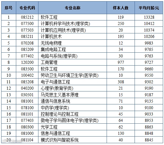 本科毕业生专业平均月薪最高前20位