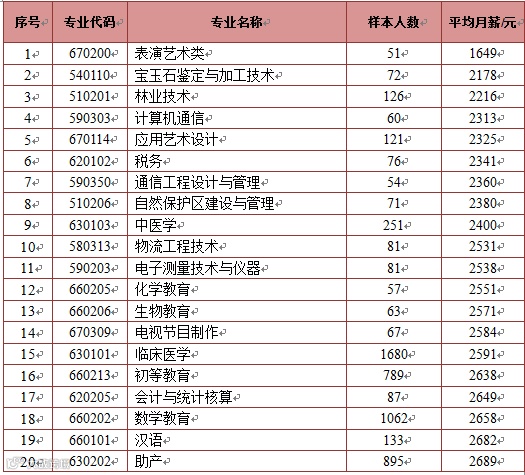 月薪最低的是专业是表演艺术类,为1649元,其次是宝玉石鉴定与加工技术,为2178元,第三是林业技术,为2216元。