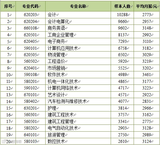 在就业人数最多的前20个专业中,月薪最高的是软件技术,为3461元,其次是计算机网络技术,为3223元;最低的是会计,为2773元,其次是建筑工程管理,为2775元。就业人数较多的专业中,比全省专科生平均薪酬(3075元)高的有商务英语(3148元)、电子商务(3110元)、计算机应用技术(3182元)、工程造价(3219元)等专业;而会计(2773元)、会计电算化(2957元)、工商企业管理(2992元)等专业则低于专科生平均水平。