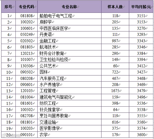 月薪最低的是专业是船舶电子电气工程,为3151元;其次是麻醉学,为3153元;第三是中西医临床医学,为3270元。